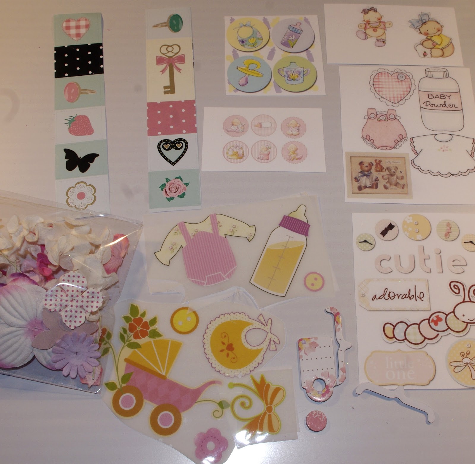 вырубка, наклейки, натирки (переводные картинки), декоративные элементы из фетра, чипборд, кружево, лента, брадсы, ок.12 отрезов бумаги для подложек под фотографии, бумажные цветы, картинки для вырезания, цифры для обозначения месяцев (1-12), бордюры, полужемчуг, стразики, вощёный шнурок.